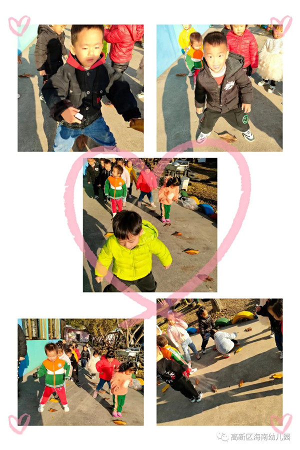 有的幼儿还将树叶顶在头上,或是放在背上,带着树叶向前走,一不小心树叶被风吹走了,他们跑着、笑着、追赶者。既愉悦了身心,又促进了身体敏捷性,平衡能力的发展。