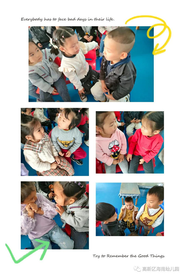 突然洋洋小朋友将树叶夹在两腿中间向前走,他边走边说:“老师你猜我的树叶在哪里?”几个宝宝寻声便一起去找他的树叶,当宝宝们发现树叶夹在两腿之间时,也跟着他玩起了夹树叶跑的游戏,时而能看到他们并排向前跑的身影,时而还能看到小朋友们之间彼此帮助的情形,大家体验着合作的快乐。