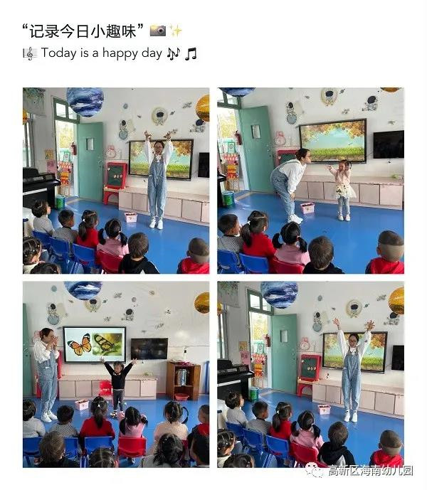 说到“就像一群蝴蝶”的时候,有些小朋友学着小蝴蝶的样子有模有样挥舞着小翅膀,于是跟随孩子们的模仿兴趣,我们一起为儿歌创编了动作!