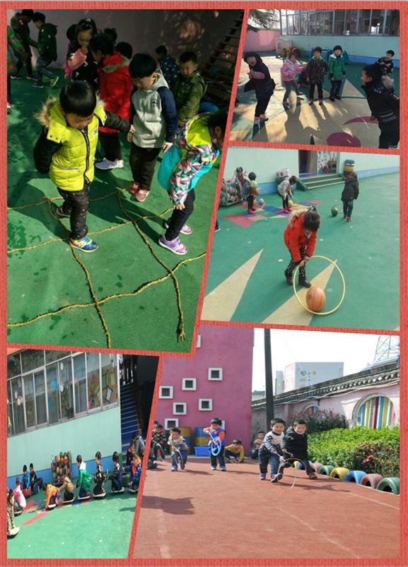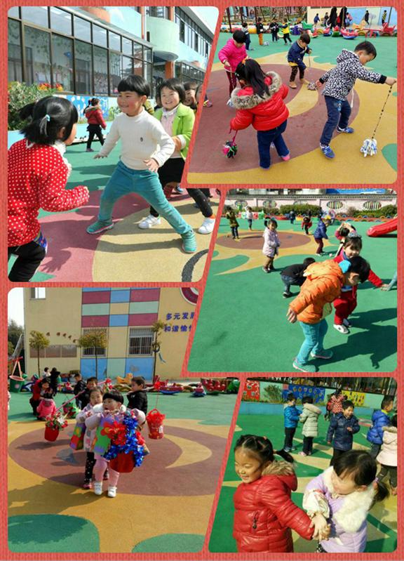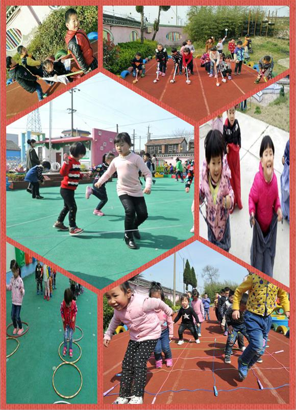 瞧!孩子们个个精神饱满,朝气蓬勃,他们开始了踢毽子、老鹰捉小鸡、玩沙包、担花旦、炒蚕豆、跳圈圈、抬花轿、赶小猪、跳皮筋、袋鼠跳、跳格子、爬梯子、花样玩球、滑板、滚铁环等一个个有趣的游戏。