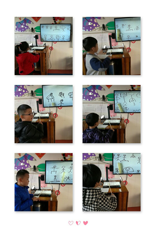 孩子们将自己画的火柴人编成一首新的儿歌讲给小朋友们听。