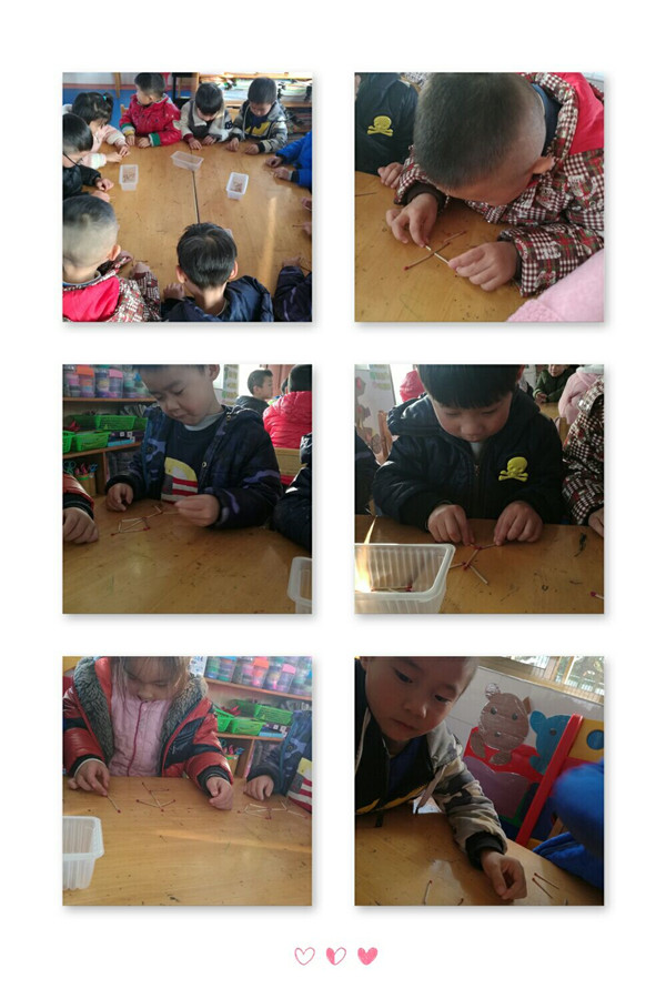 “拼个小人立正站”、“拼个小人跨步走”、“拼个小人打篮球”……在朗朗上口的儿歌引领下,孩子们大胆发挥自己的想象,用火柴棒尝试各种动作的组合。看!孩子们完全沉浸在自己的创作空间里,用火柴棒组合成各种运动小人呢!