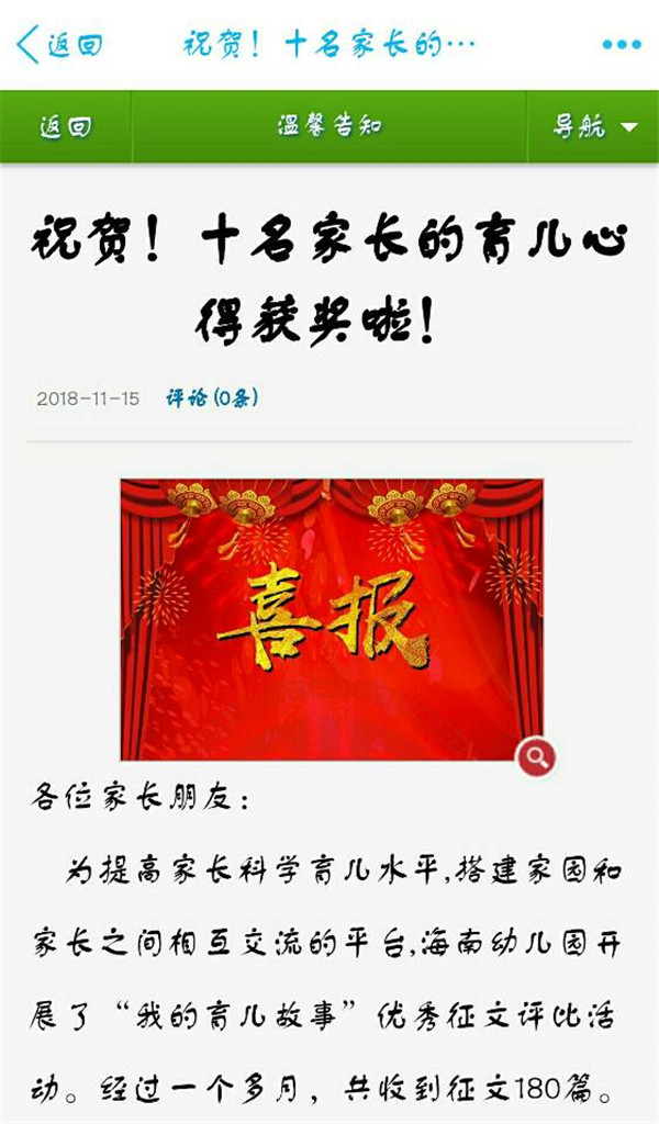 11月15日,海南幼儿园开展了“我的育儿故事”征文评比活动,得到了家长们的大力支持,他们踊跃投稿,共收到征文180篇。评选出十佳“育儿故事”发布在学校网站和幼儿园微信公众平台,进行推广宣传与分享。我园一直注重家园合作,始终把家长学校工作作为一项重要工作来抓,保证了家长工作有条不紊、有质有量地开展。通过家长育儿故事征文评比、家长进课堂、半日开放活动、家庭教育讲座等一系列活动,提升了家庭教育水平,真正达到家校携手共同成长的目标。2018年2月,幼儿园被评为“海安市示范家长学校”,项爱娟老师被评为市级优秀班主任,张艳秋、孙龙兰老师撰写的班级记事被海安市家长学校评为优秀班级记事一等奖。